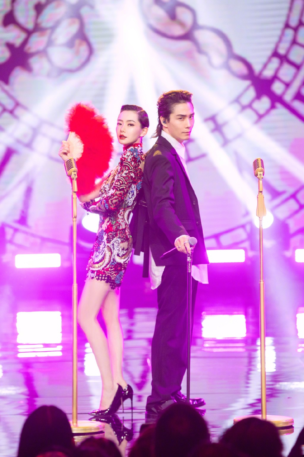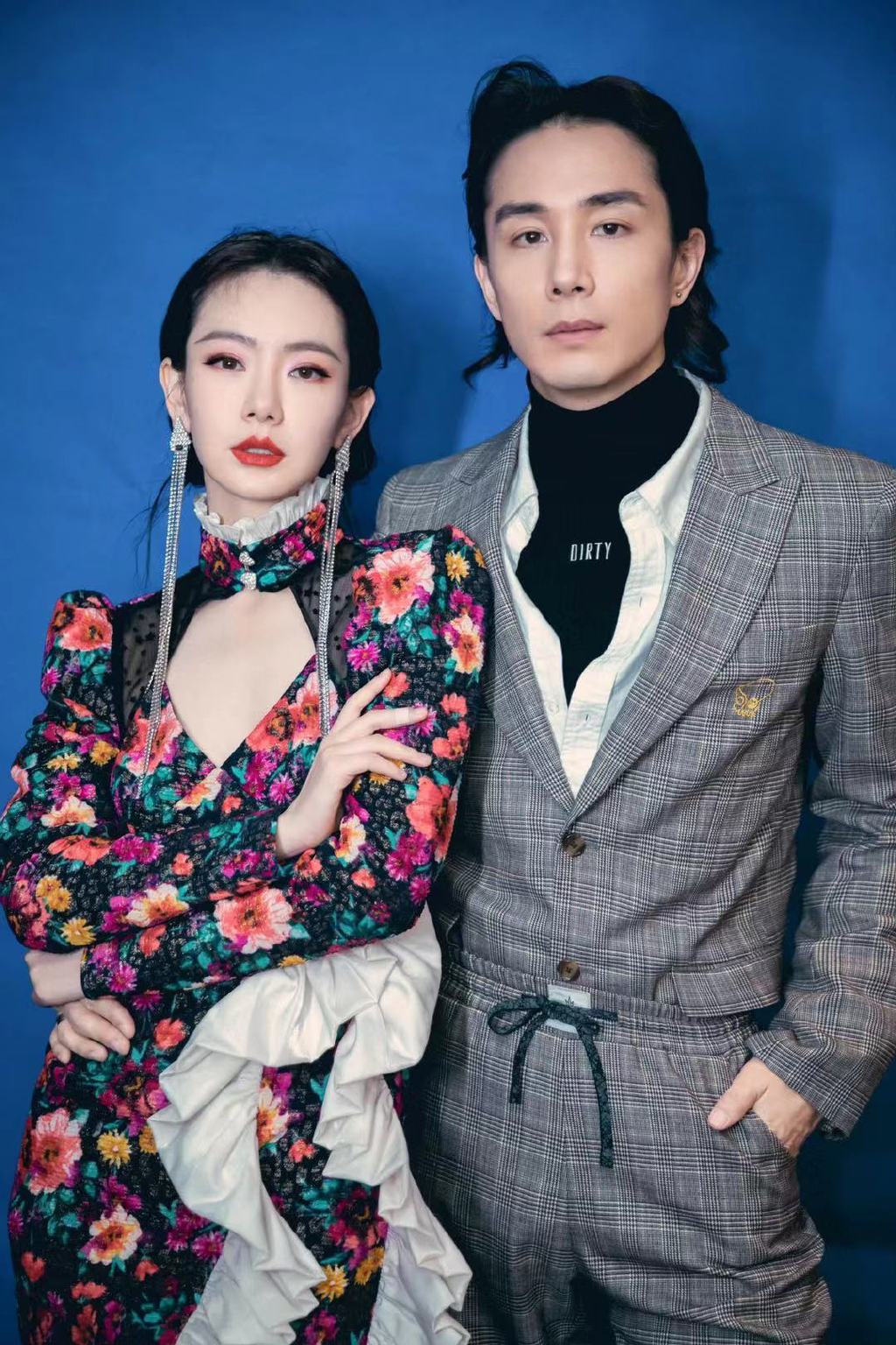 旗袍装其实更适合复古妆容,其中二八分精梳编制短发最容易点缀出年代感、复古感,不经意间展示出旧年代富丽女性的高贵典雅范,脚踩黑色漆面恨天高性感又霸气,一双又白又长的大长腿很是迷人。而老公李承铉一身黑色西装简约帅气,竖立短发更显精神气佳,遗憾的是内搭过长显得冗余邋遢,对形象大打折扣,衣着简洁修身的戚薇气场气质要比老公高出太多。