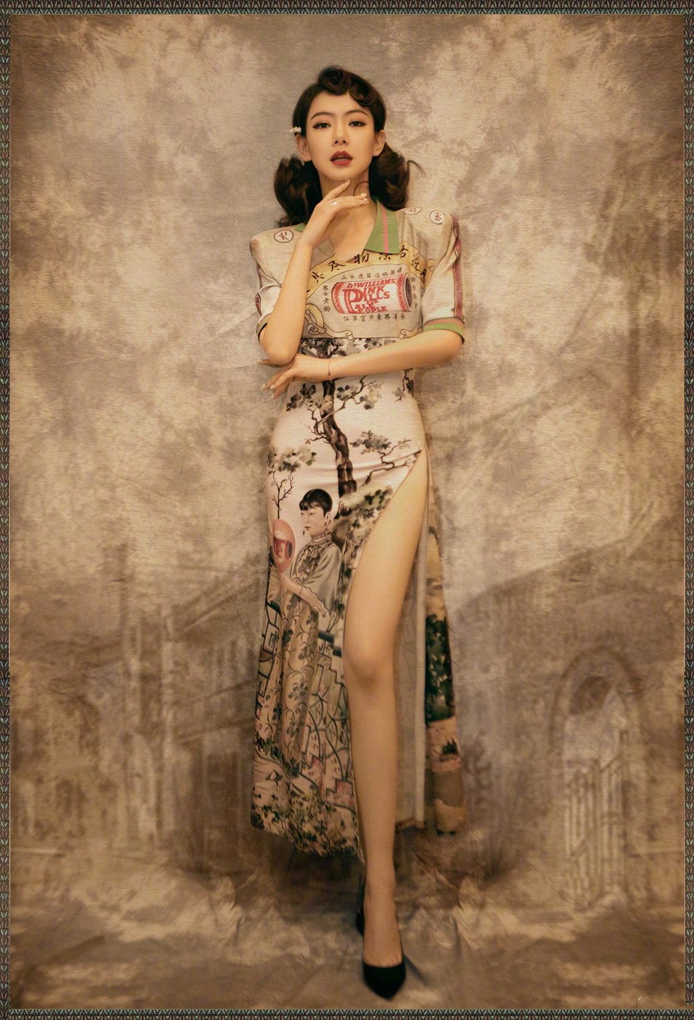 民国时期女性出席社交场合穿得最多的礼服,便是戚薇身上穿的这款旗袍装了。复古棕色系经典又怀旧,人头像与文艺文字印花显得女性知书文雅,单侧开叉独显俏皮可爱气质。不过整套造型最大的亮点还是在于戚薇的发型,前额小卷毛配发尾波浪卷的设计,彰显处灵动活泼的女性气质,复古又迷人。