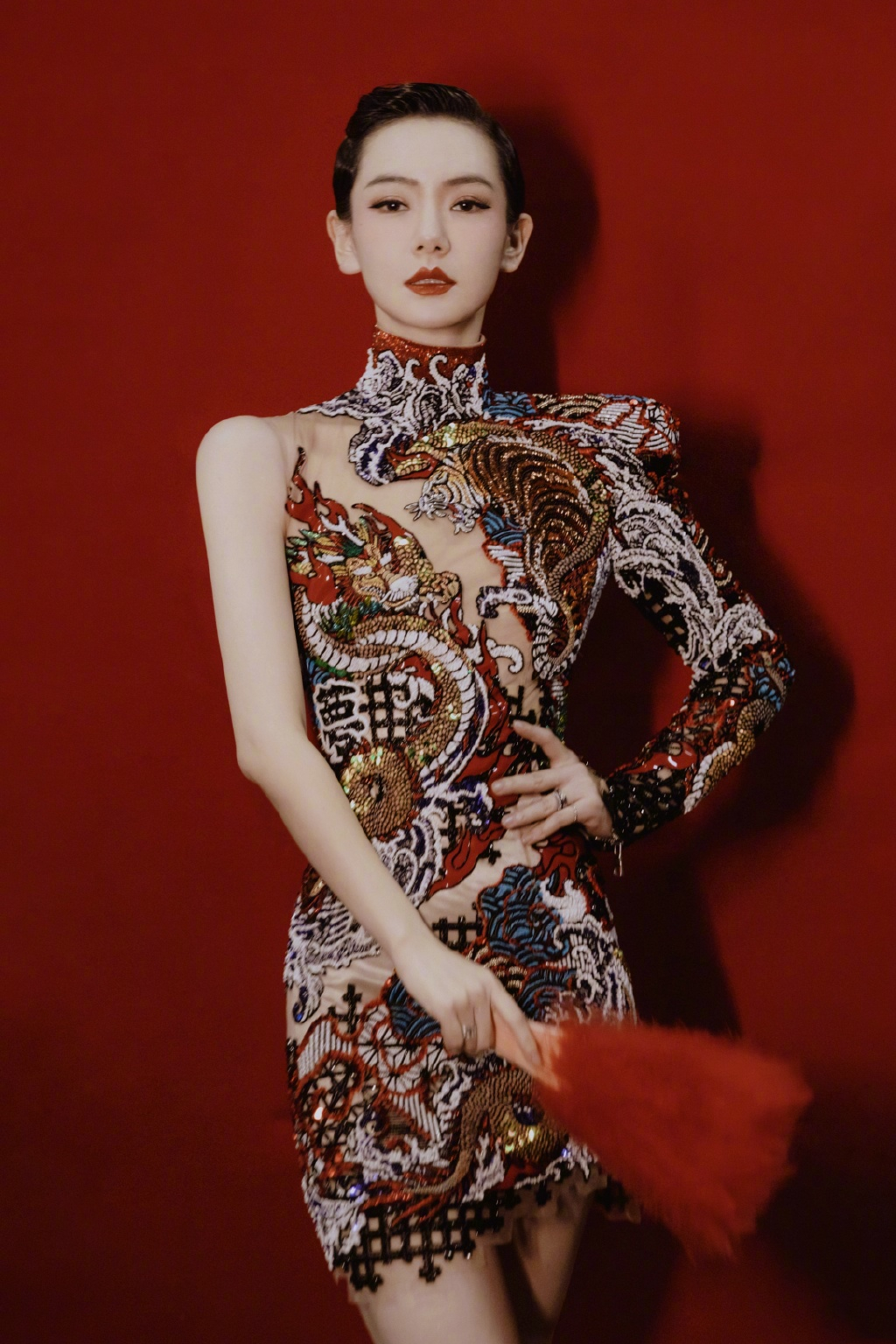 印花元素最直接呈现出旗袍固有印象,立体浮雕印花就是比平面印花更有高级感、设计感,不过驾驭难度也相对较大,对身材要求更严格;戚薇这一身龙纹旗袍惹眼又热烈,胸前斜开叉一道裸色印花,仿佛给人服装撕裂开的缺陷感,意外吸睛性感。浮雕旗袍装正式感比较强,为避免过于严肃呆板,需肩部加入单侧不对称露肩设计,解脱沉闷,释放率性洒脱气质。