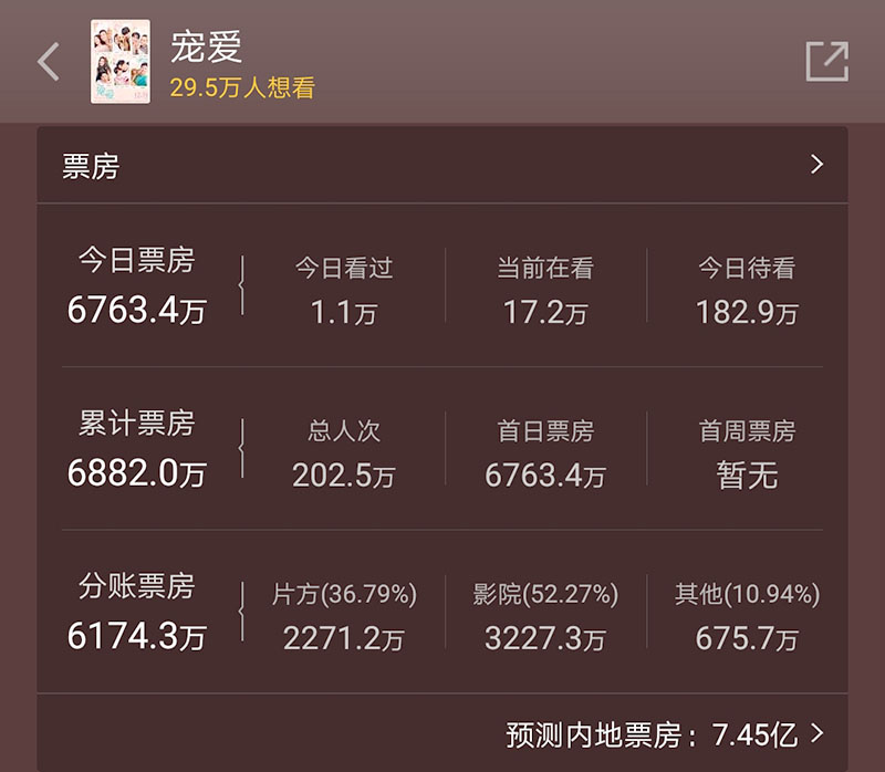12月31日,电影《宠爱》首映,截止到本文发布时间,该片内地票房超过了6700万,排片占比39.8%,上座率接近10%,预测票房更是达到了7.45亿。