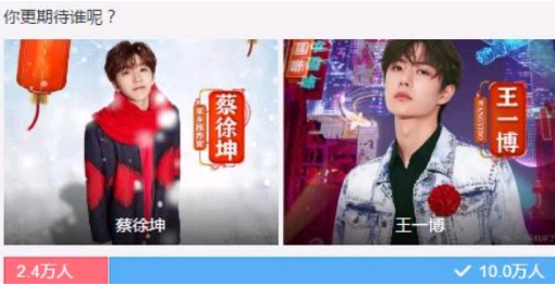 今年即将过去,迎来最重要的庆典活动——春晚,现在的春晚已经跟以前不一样,也会顺应年轻人的喜好,邀请娱乐圈最受欢迎的一些年轻明星,今年爆红的王一博和去年爆红的蔡徐坤都在名单之列,于是就有媒体发起了观众对于两人期待程度的投票。本以为是势均力敌不分伯仲的一场比赛,没想到结果出来,王一博以高票数碾压蔡徐坤,成为春晚最受期待的人,从票数上来看,王一博的票数完全是压倒性的胜利,这个票数差距大到不敢认。