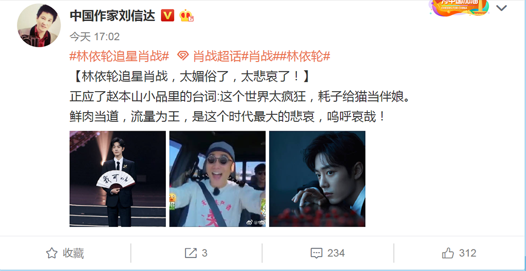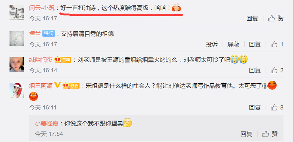 宋祖德与这位后起之秀作家刘信达,有着异曲同工妙,虽然有些时候的发声感觉还有些正义感,可是他们多数的表现都是蹭热度,博眼球。