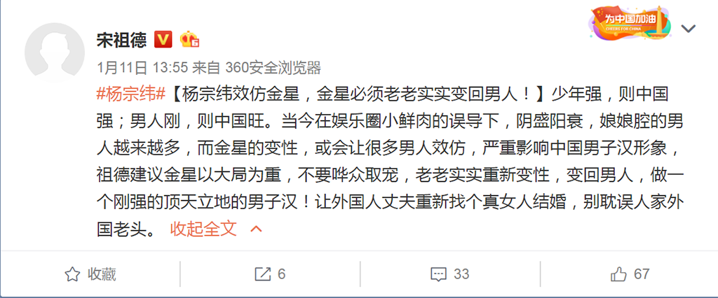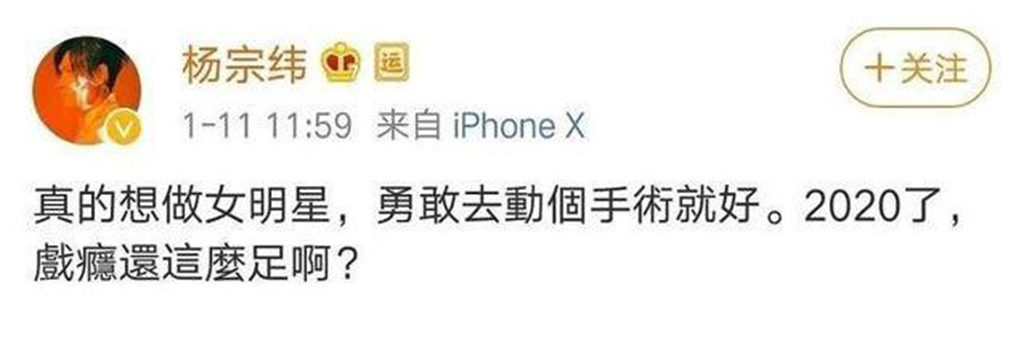 1月11日的时候,宋祖德还开腔怒杨宗纬,称:杨宗纬应该效仿金星!事情起因是杨宗纬发文内涵吴青锋,在文中表示:“真的想去做女明星,勇敢去动手术了,2020年,戏瘾怎么这么足啊。”因为一首《啊!沉默》的版权问题引发的口舌之争。