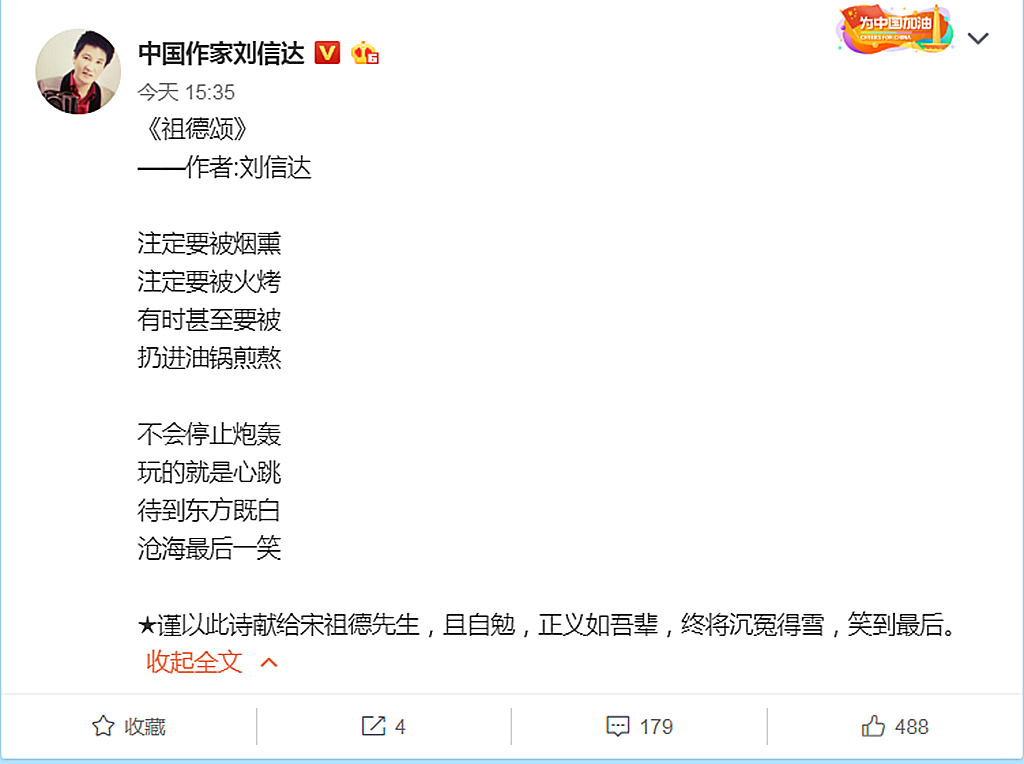 刘大作家在写完此诗之后,还不忘来个后序,称:谨以此诗献给宋祖德先生,且自勉,正义如吾辈,终将沉冤得雪,笑到最后。