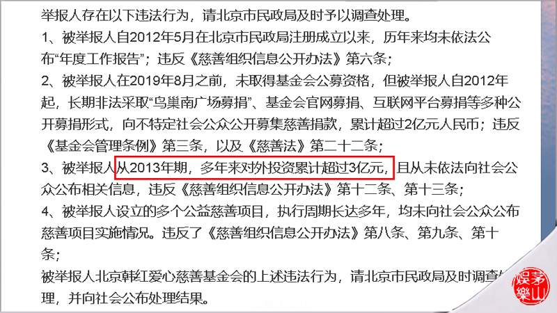然而,韩红的“高调”也让一些人恨的牙痒。同时,也令一群投机者从中看到了“商机”,这些人发现此时批判韩红,一来可以快速成名,二来可以获取高额回报。在这个“倒韩”阵营里,要数公知大V@司马3忌(其本名杨宏伟)最为活跃,他连日来除了已经在微博上发布了多篇“倒韩”文章,更是在2月13日“通过互联网举报方式,向北京市民政局公开举报‘北京韩红爱心慈善基金会’的违法行为”,直指“韩红爱心慈善基金会”从2013年开始,对外投资累计超过3亿元,且从未依法向社会公众公布相关信息。简言之就是,有3亿多的善款下落不明。