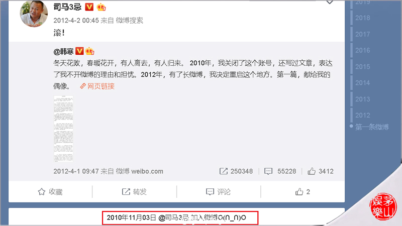 其实,很多网友不理解,为什么这位公知大V@司马3忌(其本名杨宏伟)死咬一直在做着实事的韩红,在不排除他背后还有其它利益集团的情况下,咱们看看公知大V@司马3忌(其本名杨宏伟)的过往。现年59岁的@司马3忌,微博上发家就是靠“倒韩”,只不过那个“韩”是青年作家韩寒,通过在网上“群殴”韩寒,他和大名鼎鼎的方舟子成了“战友”(也有一说,说他是方舟子的弟子),他现在微博上显示的第一条博文就是让韩寒“滚”的微博。
