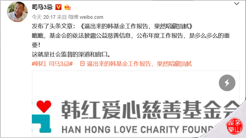 如今,尽管韩红得到了无数网内明星和广大网友的支持,但公知大V@司马3忌(其本名杨宏伟)显然并没有打算放手,就在2月17日晚 20:17分,他又发布了头条文章:《逼出来的韩基金工作报告,果然暗藏猫腻》 ,并称“瞧瞧,基金会的依法披露公益慈善信息,公布年度工作报告,是多么多么的重要!这就是社会监督的渠道和窗口。”这其中有多少真实可信的,还是希望有关部门能给出可靠的答案吧。希望最终坏人能得到应有的惩罚,希望好人得到应该的保护。