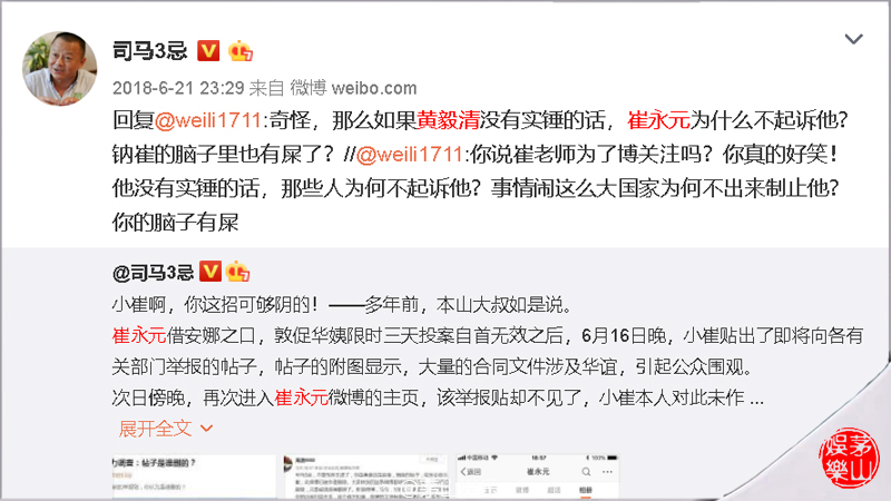 在与方舟子成“战友”后,方舟子的敌人自然也就是@司马3忌的敌人了,于是他就开始对崔永元及“崔永元公益基金”开始不停的网上爆料、喊打,在2018年崔永元因《手机2》对冯小刚“开炮”后,@司马3忌又跳了出来,当时他和黄奕的前夫黄毅清成了新战友,事后证明,曾经被无数网民捧为“娱乐圈新纪委”黄毅清,不过是外强中干的角色,他在网上所爆出来的猛料多为其虚构而来,他更是在与周立波的骂战中不光败下阵来,更是亲自把自己送进了监狱。黄毅清进去了,但公知大V @司马3忌(其本名杨宏伟)却安然无恙。