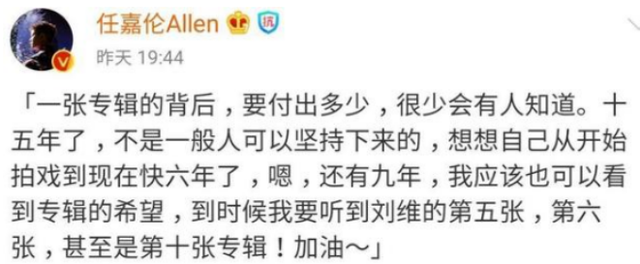 此外,在众多艺人中,任嘉伦的宣传也是非常吸睛。别人都是较为简短的恭贺,而偏偏只有他,写了像是小作文一样的评论。不过从任嘉伦的话语中,我们也确实感受到了他对刘维这些年努力的肯定,以及对他如今成绩的祝福。任嘉伦还表示自己希望看到刘维之后更多的专辑,言辞中流露的兄弟情也让一众网友颇为感动。