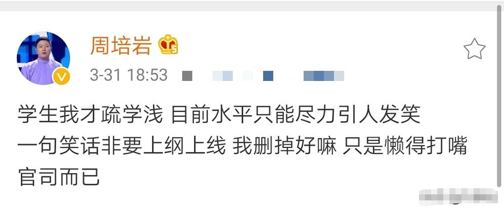 他先是把之前的微博状态删除,并发文认错:学生我才疏学浅,目前水平只能尽力引人发笑,一句笑话非要上纲上线,我删掉好嘛,只是懒得打嘴官司而已。”