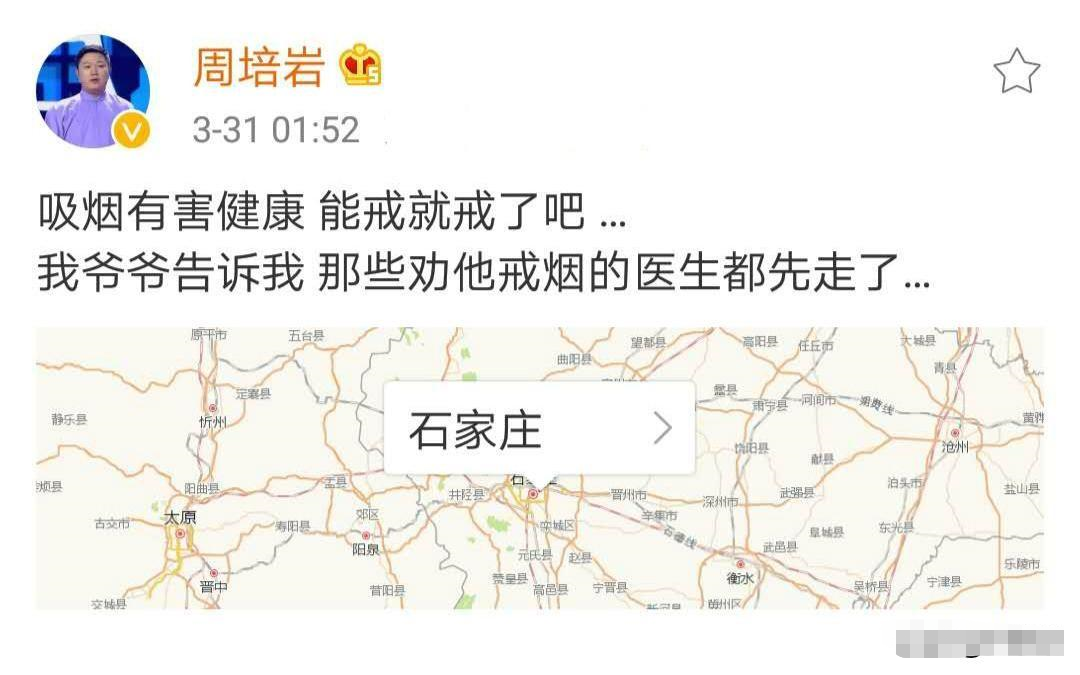 相声演员周培岩,德云社评书演员周培岩闲来无事在自己的社交平台发布了句调侃的话语:吸烟有害健康,能戒就戒了吧。我爷爷告诉我,那些劝他戒烟的医生都先走了…”