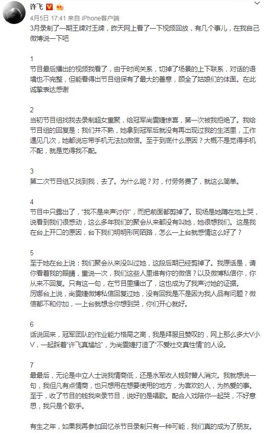 在这期节目播出之后,许飞还将“声讨”延续至了台下,特别发了一条长文来对自己参加这期节目录制的原因和前后过程进行了详细的解释,同时还表示自己曾在工作交集中向尚雯婕索要过几次微信,但是每次都被尚雯婕拒绝了,而且发微博私信给她也是从来都不回复,两人的真实关系其实形同陌路。