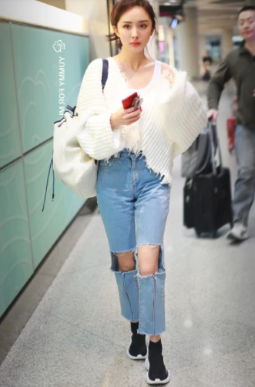 这款“拉丝裤”她们两个人都很爱穿!不仅日常出街要穿,鞠婧祎的这条“拉丝裤”在《朋友请听好》中出镜率也很高!大家可以看到这其实就是一款破洞裤。破洞裤因为个性、张扬魅力成为明星icon们必备的时尚单品,如果你的衣橱里没有件破洞裤的话是不配做“时尚弄潮儿”的。