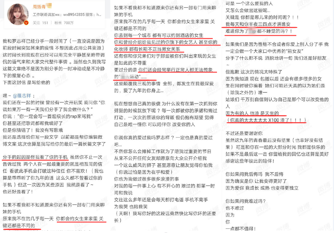 想必不少人今天被周扬青的一篇微博给震惊到了吧?在公众面前,一向帅气、可爱、沙雕、专一的小猪罗志祥人设彻底崩塌。在这篇长微博中,周扬青爆出了她与罗志祥的分手原因,她控诉罗志祥多次劈腿,与不同女生到酒店或者家里过夜,甚至与旗下艺人、化妆师都保持着长期不正当关系,而分手起因就是看了罗志祥的手机,