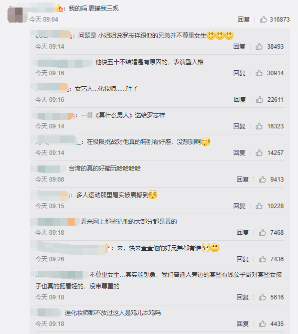 一时间网友对于罗志祥这种渣男行径开始了吐槽,有网友说:“毁三观”“一首《算什么男人》送给罗志祥”“他快五十不结婚是有原因的,表演型人格”“女艺人...化妆师......吐了”还有罗志祥跟他的兄弟不尊重女生。