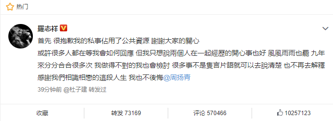 在周扬青发文痛斥罗志祥渣男行径三个小时候后,罗志祥终于发文回应了,他说道:“我只想说两个人在一起经历的开心事也好,风风雨雨也罢,九年来分分合合很多次,我做得不对的我也会检讨,很多事不是只言片语就可以去说清楚,不再去解释。感谢我们相识相恋的这段人生,我也不后悔@周扬青”