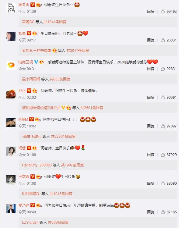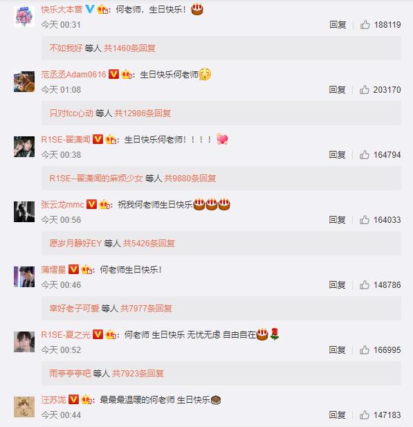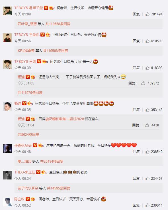 此外还有好多明星发了微博祝何炅生日快乐,但是,要说最热闹的当然是何炅那条生日微博下的了,评论下非常的经常,排在前面的基本都是明星,网友称它为“何榜”,还有网友开玩笑的说;“前100评论能有一个是何炅粉丝”。可见何炅的好人缘。这么多明星聚集来祝福,在别的明星那里是看不到的。