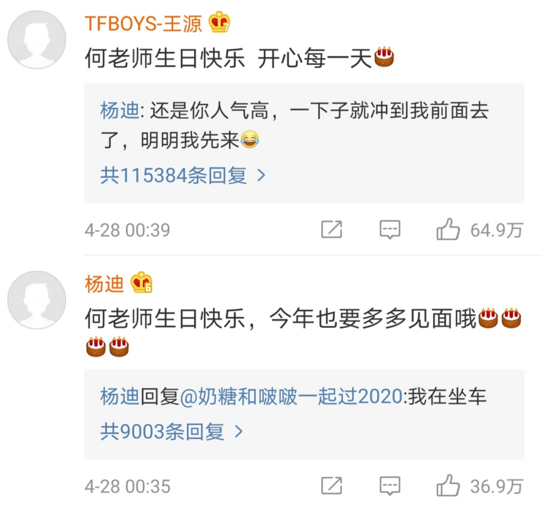 最有意思的莫过于杨迪了,杨迪在0点35分就已经评论祝福了,后来在0点39分王源才回复祝福的,但是,不久后王源的点赞就超过了杨迪,杨迪就去评论王源:“还是你人气高,一下子就冲到我前面去了,明明我先来”,虽然杨迪这种看似“不爽”“酸”的话,但是并没有惹人反感,反而觉得很搞笑,因为了解的人都知道杨迪就是开玩笑的,他其实在求安慰,哈哈哈!