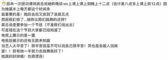 网友还说,吴昕特别的拼命,她总是晚上8点多开始上课,一直到12点,在这四个多小时的时间里,吴昕从未间断过。回到家里后,吴昕还会继续排练,一直练到凌晨5点,也就是说,吴昕每天花上九个小时的时间,锻炼。
