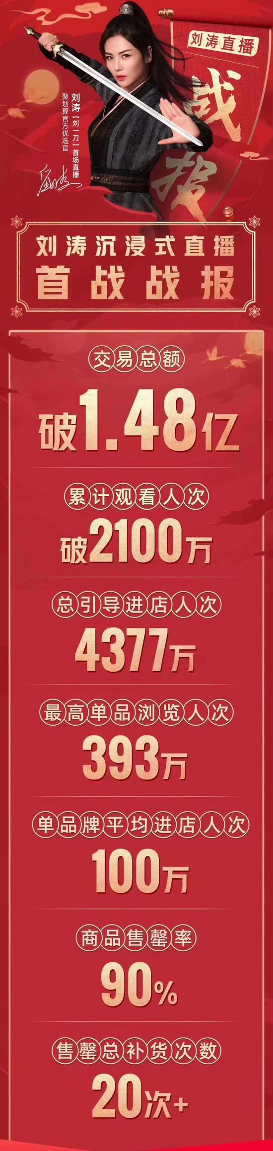 5月14日刘涛晚间进行了长达四小时的在线直播带货,而且直播间的人数高达二千多万,甚至超过了同行各大直播间的人数。当天李佳琦直播间的在线人数才六百多万,人数可以说是李佳琦的三倍。刘涛每当介绍一个产品都会肯定质量,每一个在直播间的人都给刘涛最好的评价。虽然刘涛是首次带货直播的时候根本不像第一次,也许是因为有演员的功底在直播的时候非常自如。评论最多的都是大爱刘一刀,刘涛给粉丝带来很多优惠力度大的产品一晚上的销量以及销售金额达到了1.48亿元的佳绩。