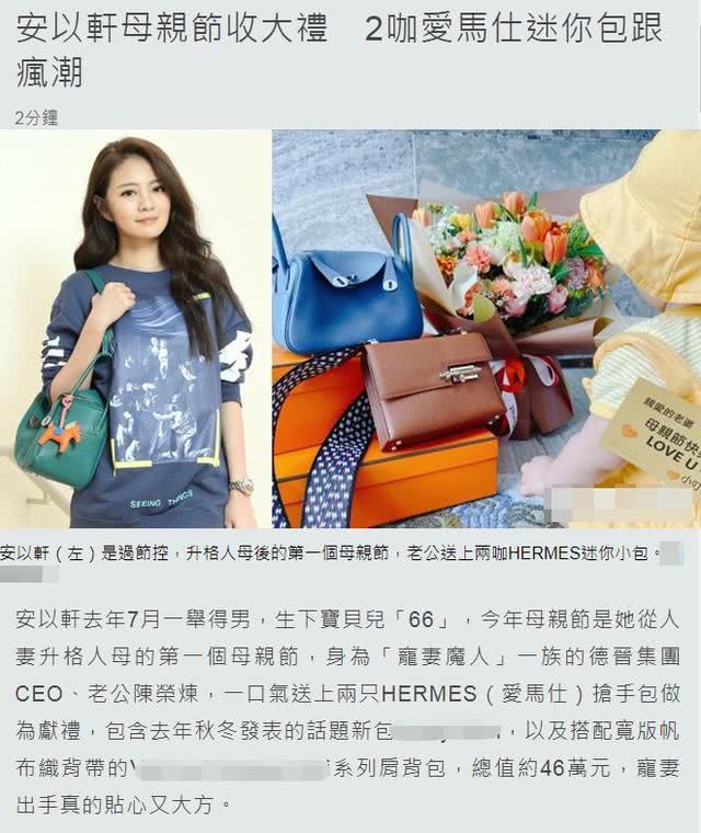 上个星期天是母亲节,安以轩收到了两个爱马仕包包,价值46万台币。