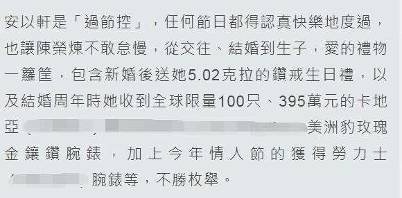 因为安以轩喜欢过节日,每年的节日,陈荣炼都不敢怠慢,从两个人开始交往的时候,陈荣炼就十分积极的送礼物。