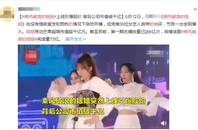 如果说有哪档节目能无预警开播想上线就上线还引起一片热潮,那也只有《乘风破浪的姐姐》了。不仅上线赶上热搜停更,小伙伴们手动也要送姐姐们上热搜,每一位姐姐都各具特色自带热度,一上线不仅累计播放量已达6亿,就连股价都被引爆,背后公司市值已破千亿!