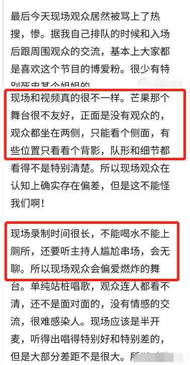 现场录制时间长,现场观众能坚持看完比赛就不错了,累到昏昏欲睡,自然又A又燃、节奏明快的歌曲更感兴趣。