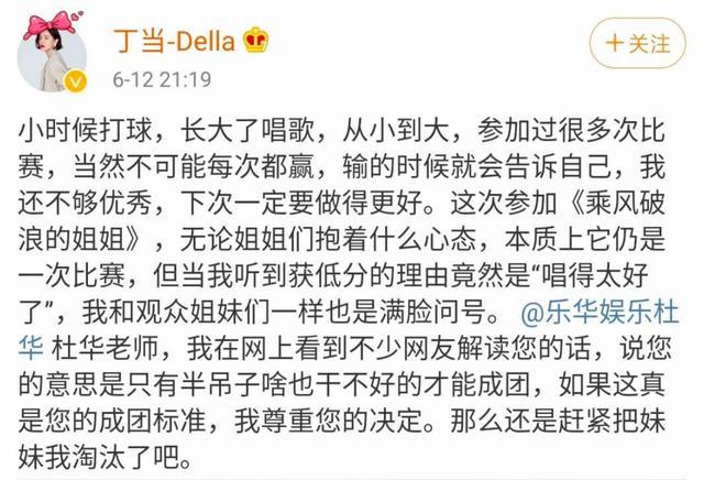 第一个拿祭天剧本的姐姐非丁当莫属,从节目开播到被淘汰,丁当就一直是占据话题中心的人物,初舞台的优秀表现,因为唱得太好被杜华打了低分,这样的离谱评分标准,让丁当忍不住发文开撕杜华,让杜华赶紧把自己给淘汰了,丁当也成为《乘风破浪的姐姐》中第一个开撕的姐姐。