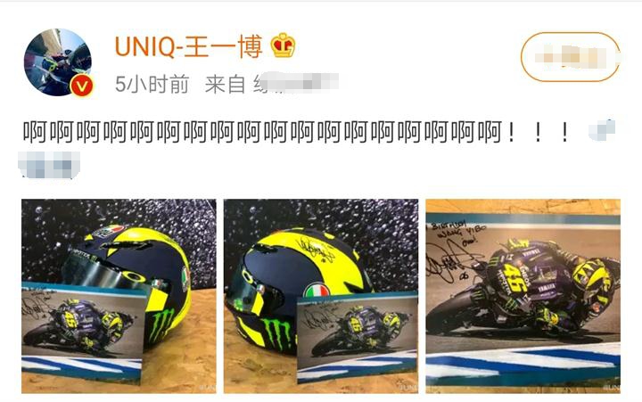 在近日,一直视意大利国家职业摩托车车手瓦伦蒂诺·罗西为偶像的王一博,在社交软件上晒出了一张偶像罗西的签名照,还配上一大串“啊……”的尖叫声,从晒出的照片上看,不仅上面有罗西的亲笔签名,还有祝福王一博生日快乐的话语和一串王一博名字的拼音字样!可以肯定的的王一博收到这些礼物的时候,一定是激动万分的,甚至可以说有些激动到失态的感觉!