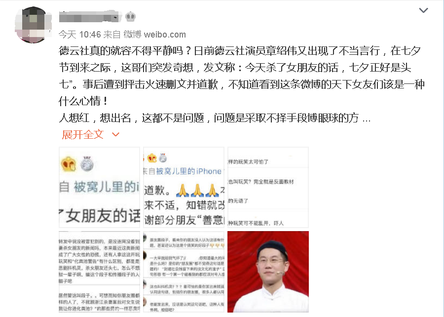 网友在爆料中称:德云社真的就容不得平静吗?日前德云社演员章绍伟又出现了不当言行,在七夕节到来之际,这哥们突发奇想,发文称:今天杀了女朋友的话,七夕正好是头七”。事后遭到抨击火速删文并道歉,不知道看到这条微博的天下女友们该是一种什么心情!