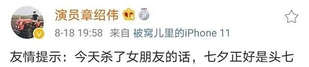 通过网友的描述,我们查阅了一下事件过程,原来在前几日,德云社相声演员章绍伟在因为“七夕”的到来之际在社交平台抖机灵,称:“友情提示:今天杀了女朋友的话,七夕正好是头七”。