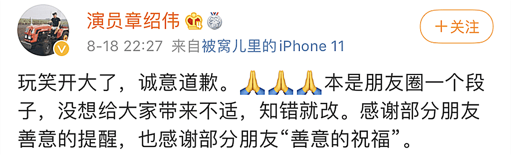 删除动态之后,他主动发布了一条道歉文,称自己所说的只是一个朋友圈的段子而已,没想到会带给大家不适,并阴阳怪气地称感谢大家“善意的祝福”,其实明眼人一看就知道指的是大家痛骂他的那些话。