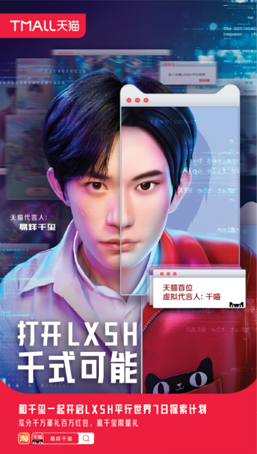 由此,也给了天猫新的启发:或许,与年轻人沟通的最好方式,不是告诉他们理想生活是什么,而是让他们自己到天猫来发现、构筑一个属于年轻人的理想生活空间——在淘宝、天猫APP内,打造了一个天猫LXSH平行世界(理想生活以年轻人习惯的缩写形式表达),由一位跨次元的icon易烊千玺虚拟形象“千喵”,带领着所有年轻人跨越三次元,一起到天猫平行世界里来自己体验和打开理想生活的千式可能。