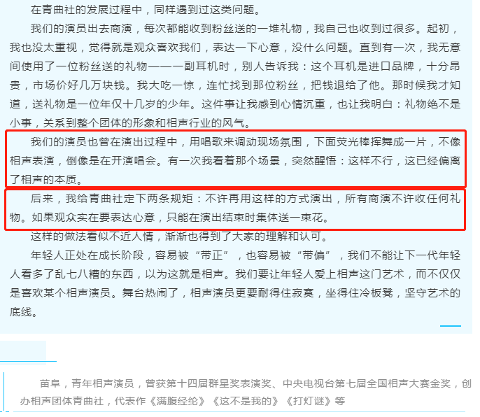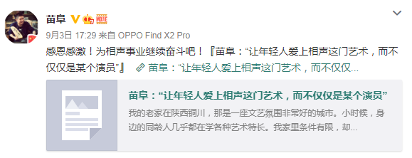 自苗阜的身份不一样之后,苗阜也是很少在公开批评一些相声圈内的事情,也是注重为西安曲艺团吸纳人才,但不知为何突然在9月3日突然转发了一篇关于自己的访谈,访谈里再次提及了一些事情让苗阜再次回到了观众的视线中。