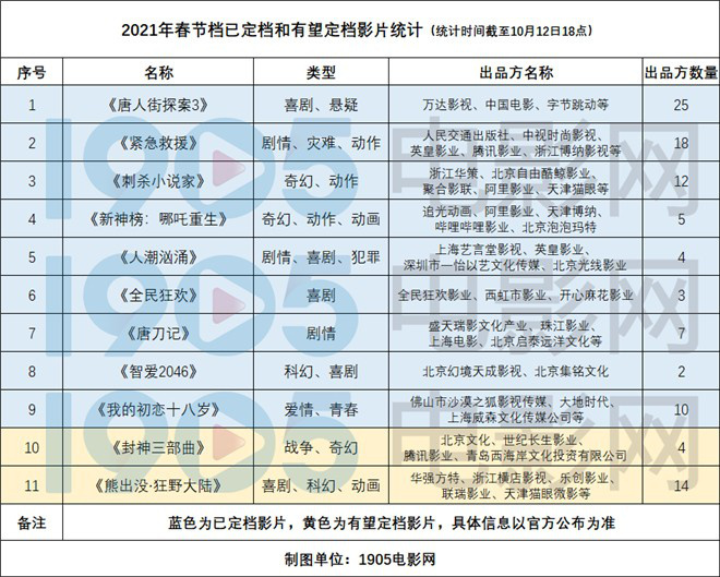 2020年因疫情原先定档的春节期间的电影纷纷撤档延期,随着疫情控制,各大影院也开始复工,国庆档之后,春节档势必掀起一波观影高潮。
