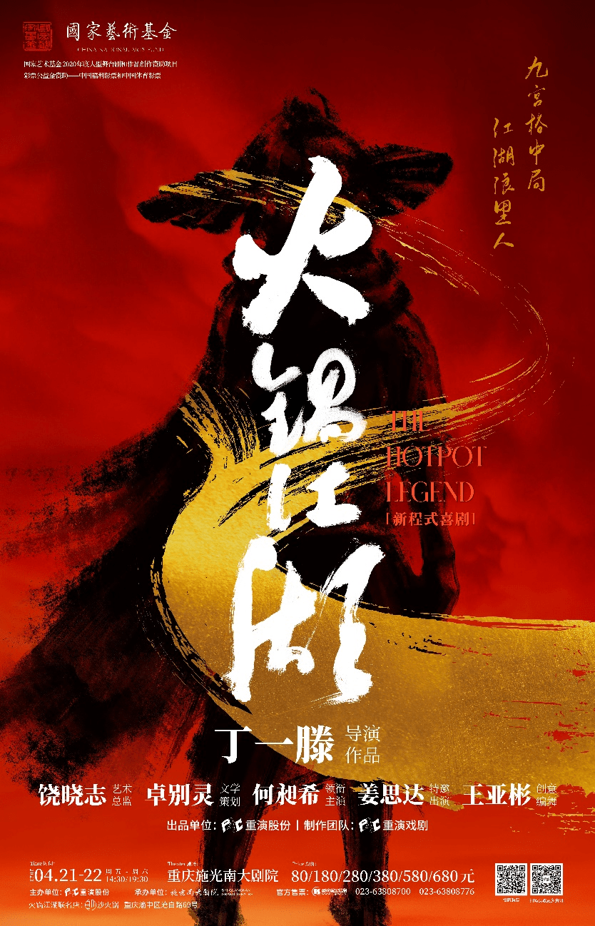 由重庆演艺股份有限公司出品,重演戏剧制作,戏剧“鬼才”丁一滕执导,著名导演饶晓志担任艺术总监,青年演员何昶希、姜思达主演,知名舞蹈艺术家王亚彬编舞的国家艺术基金2020年度大型舞台剧和作品创作资助项目《火锅江湖》将于2023年4月21日-22日在重庆施光南大剧院首演。《火锅江湖》的故事发生在抗战时期的重庆,小混混隋便、地下党齐大邦、军阀副官胜利等人阴差阳错相聚在江湖火锅店,与女当家耀楠等各色江湖人士,靠自己的力量捍卫家国。