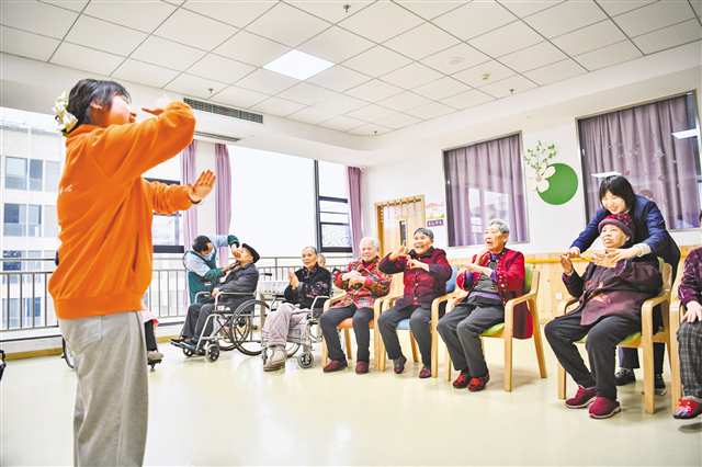 1月17日,巴南区花溪街道社区养老服务中心认知障碍照护专区,志愿者帮助老人复习学习的歌曲和动作。记者 谢智强 实习生 康海雨 摄/视觉重庆