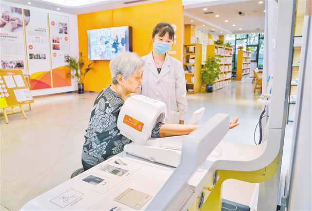 江北区江北城惠源家社区养老服务中心,护士在给老人做餐前血压血糖检测。(本报资料图片)首席记者 崔力 摄/视觉重庆