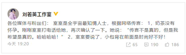 针对网传刘若英怀二胎一事,刘若英工作室发声明否认,透露奶茶本人表示“传言不是真的,但是我希望是真的。”工作室还俏皮表示小包背在前面是时尚!早前刘若英身穿宽松T恤现身机场,并将挎包背在小腹位置,引发怀孕猜测。