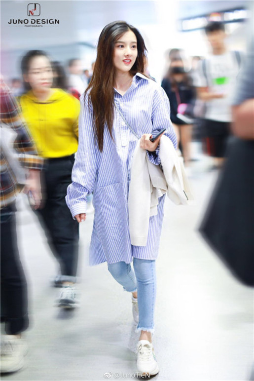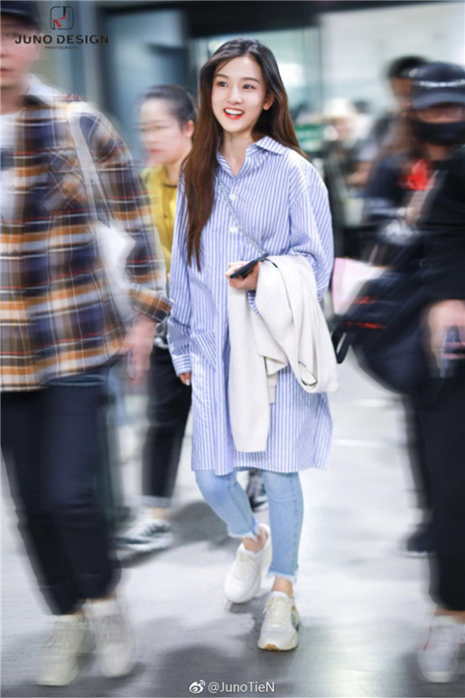 昨日,98后人气小花宋祖儿现身北京机场,身穿蓝白条纹长衬衫,下装牛仔长裤搭配白色运动鞋,斜挎小包轻松又时尚,将经典搭配穿出了独有的青春少女感,一路上宋祖儿对着镜头甜笑招手心情大好,状态满分元气十足!