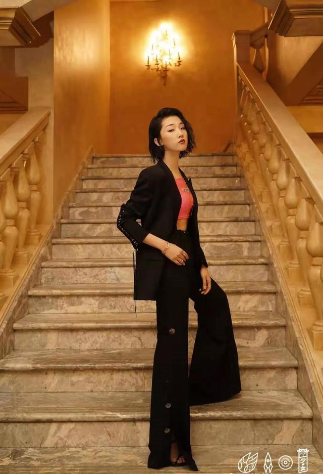 另一套造型中,yamy又换了一种风格,她单手叉腰,站在楼梯上,一头短发简单干练,西装外套下马甲线若隐若现,开叉长裤大秀美腿,微微抬起的下巴,尽显其高贵气质。