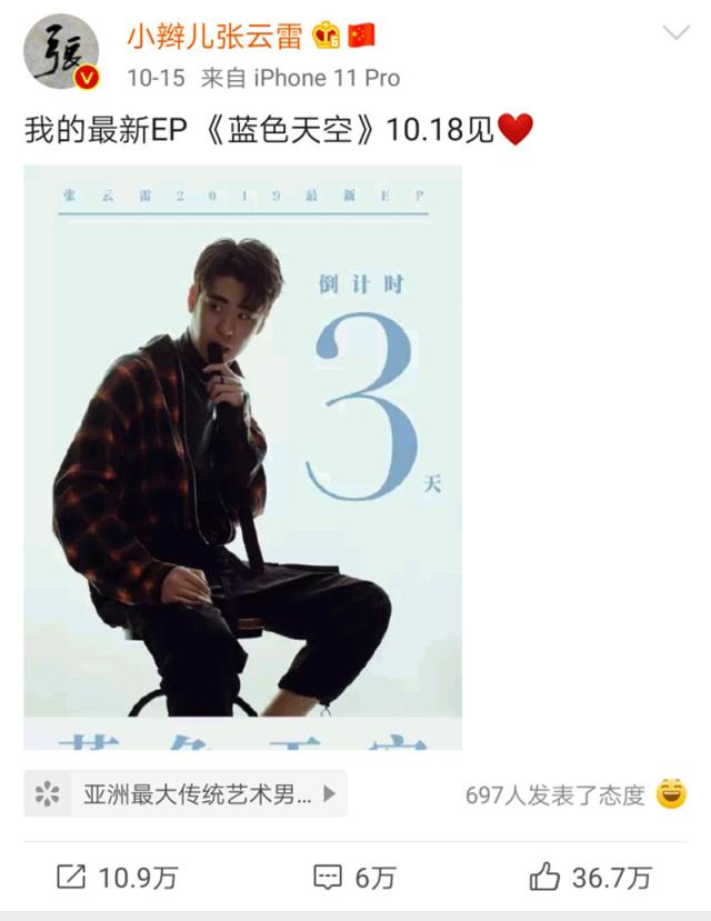 张云雷的最新EP《蓝色天空》将于10月18日正式发行,这也是他继毓贞之后,在音乐领域的第二次尝试。