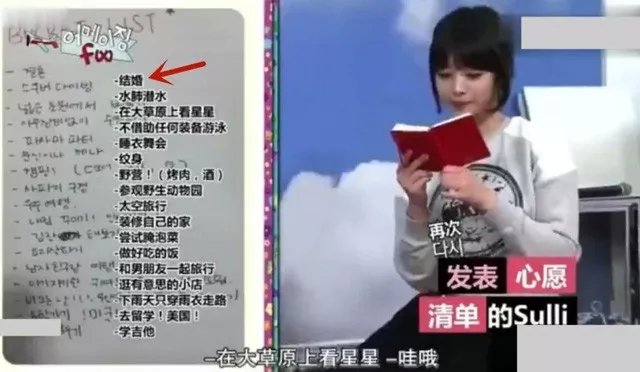 而从曝光的视频来看,崔雪莉的清单里面,很多都是很普通的事情,比如睡衣舞会、纹身、野营(烤肉,酒)、下雨天只穿雨衣走路等。这些对普通人来说,想到就可以去做到。但对崔雪莉来说,或许是因为事业发展太快了,所以属于个人的时间是很少的。或许,也是因为这些,崔雪莉才有了抑郁症。那就是,光鲜的背后,是她们没有办法安排自己的时间,所以,简单的事情,她都没有办法去做。而在这样的清单里面,第一个愿望就更加让人如鲠在喉了。这样的愿望就是:结婚。对崔雪莉这样的大美女来说,找个喜欢的人不难,但她没有时间啊,所以,也变成了一种奢望。