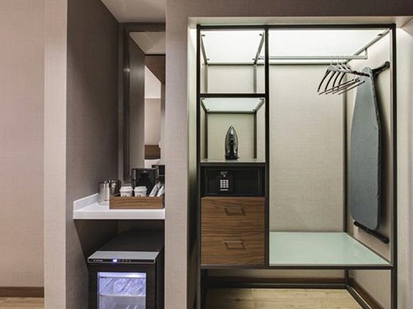Moxy酒店的小客房面积约17.2平方米,所以我们的设计必须要有创意才能让房间内的空间最优化的使用。“如果你打算把衣物放在壁橱里,那么对于Moxy而言就没有了其他的空间”,Kahn说。于是Kahn和其他设计师设计出了一个开放的壁橱,在壁橱的上方有衣架,下方有一个支架用来放行李箱,旁边设计了几个抽屉和小型保险箱可以用来放小物品。