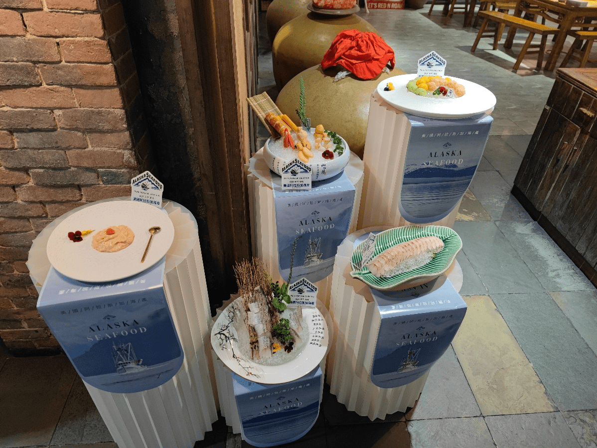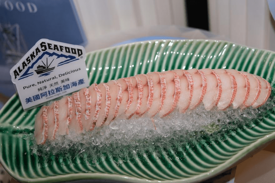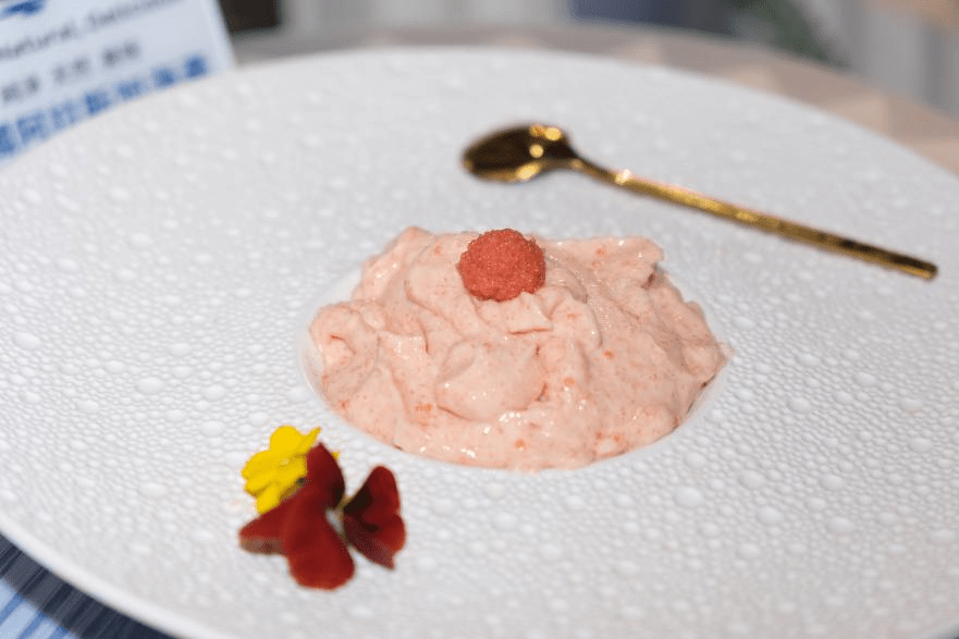 这次的阿拉斯加黄金鲽深受来宾喜爱,鲽鱼肉被做成三种不同颜色的鱼丸。鱼丸的颜色由菠菜汁、南瓜泥、和阿拉斯加狭鳕鱼子混合而成,既吸引了大家的目光,又保证了食材的安全。