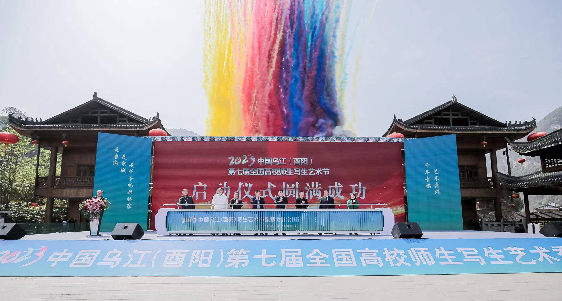 来自上海、福建、贵州、河北、湖南、湖北、四川、山东等地的艺术家、院校师生等千余人,在这春和景明、万物生辉的美好时节相约龚滩相会盛典,共同见证了“2023中国乌江(酉阳)第七届全国高校师生写生艺术季”的隆重启幕。中国美术家协会理事、中央文史馆书画院院长马新林,中国美术家协会理事、中国美协水彩艺委会副主任兼秘书长、浙江省美术家协会副主席骆献跃,中国美术家协会理事、重庆市美术家协会副主席兼秘书长、中国美术家协会重庆创作中心主任魏东,酉阳自治县县委副书记、县长杨通胜,酉阳自治县人大常委会副主任赵明,酉阳自治县人民政府副县长熊伟等嘉宾和领导出席了开幕式现场。开幕式上,14家美术院校、协会和机构授予龚滩古镇“写生基地”,武陵山美术家联盟对武陵山四地联盟成员授了牌,还有重庆市美术家协会、重庆传媒职业学院与酉阳县人民政府签订了战略合作协议。