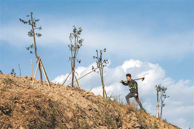 3月28日,巫溪县蒲莲镇兴鹿村,村民在山坡上检查今年新栽种的老鹰茶树苗。