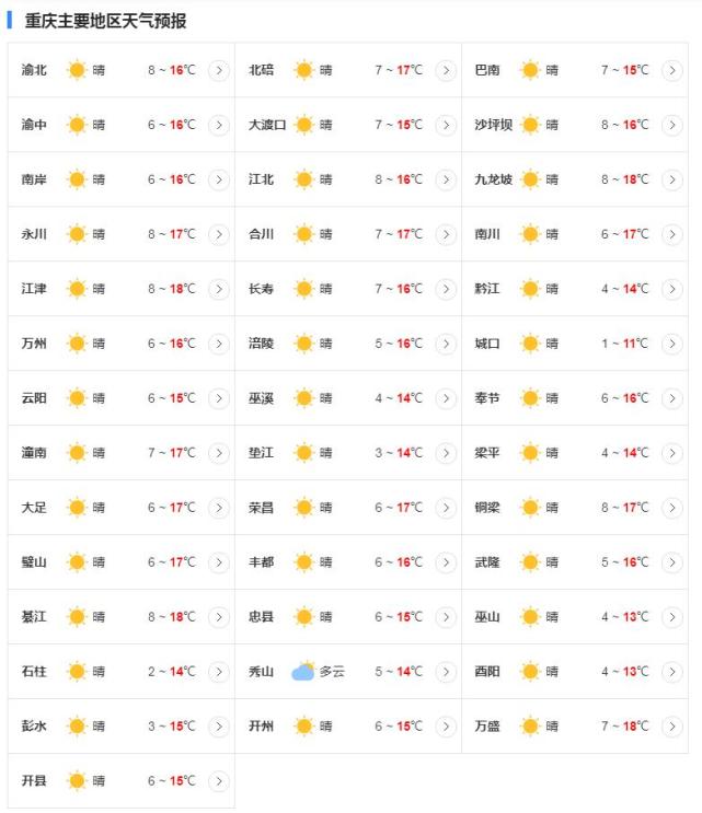 5日夜间到6日白天,各地多云到晴,坪坝河谷地区早上有雾。大部分地区气温4~19℃,城口及东南部1~15℃。主城区:多云,早上有雾,8~17℃。